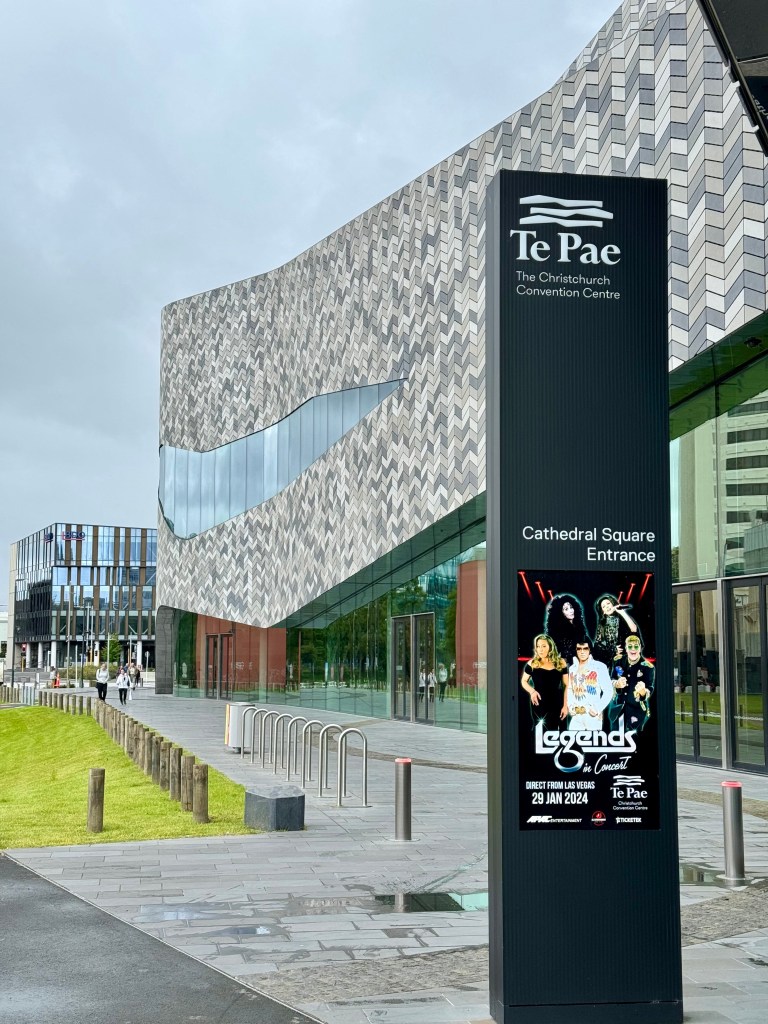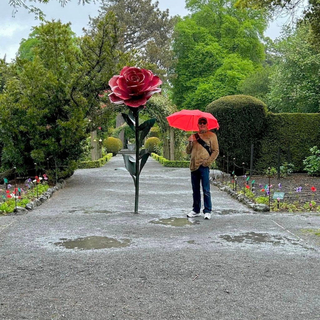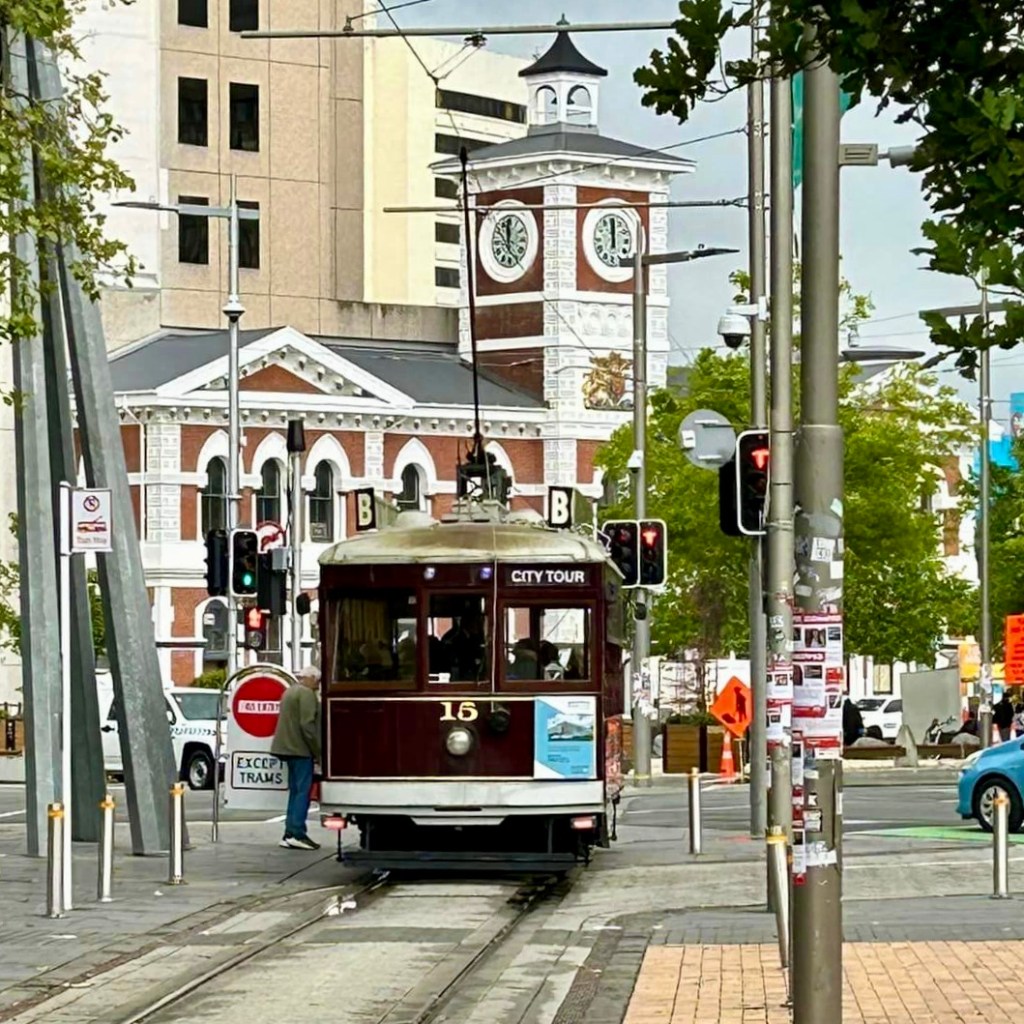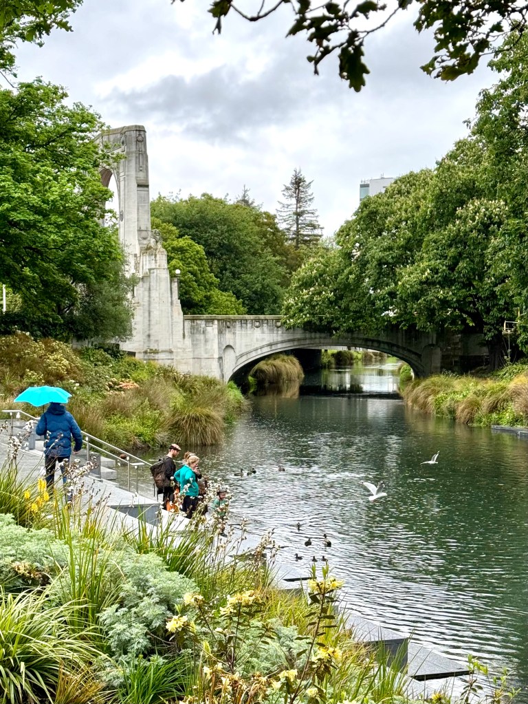 At the entrance to the rose garden.Lunch at the Curator’s House Cafe.Just like England, but swans are black.Enjoying the Avon River, Kiwi-style.Boys everywhere will chase birds.Braided rivers influenced the design.Completely restored after 2011.Cathedral Square Clock Tower.Christ Church Cathedral (in progress).Sadly, some homes are still shut.Kiwis have an eye for art.