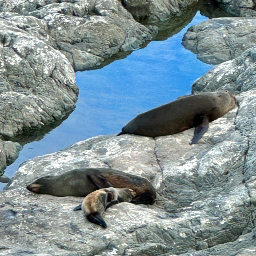 First view of the South Island.The views are worth the ferry ride.Lots of traffic crosses via the ferry.The South Island port town of Picton.St. Clair Family Vineyard lunch.Gorgeous scenery, like nowhere else.Nursing seal pups, just north of Kaikōura.Sheep graze safely — no predators here!